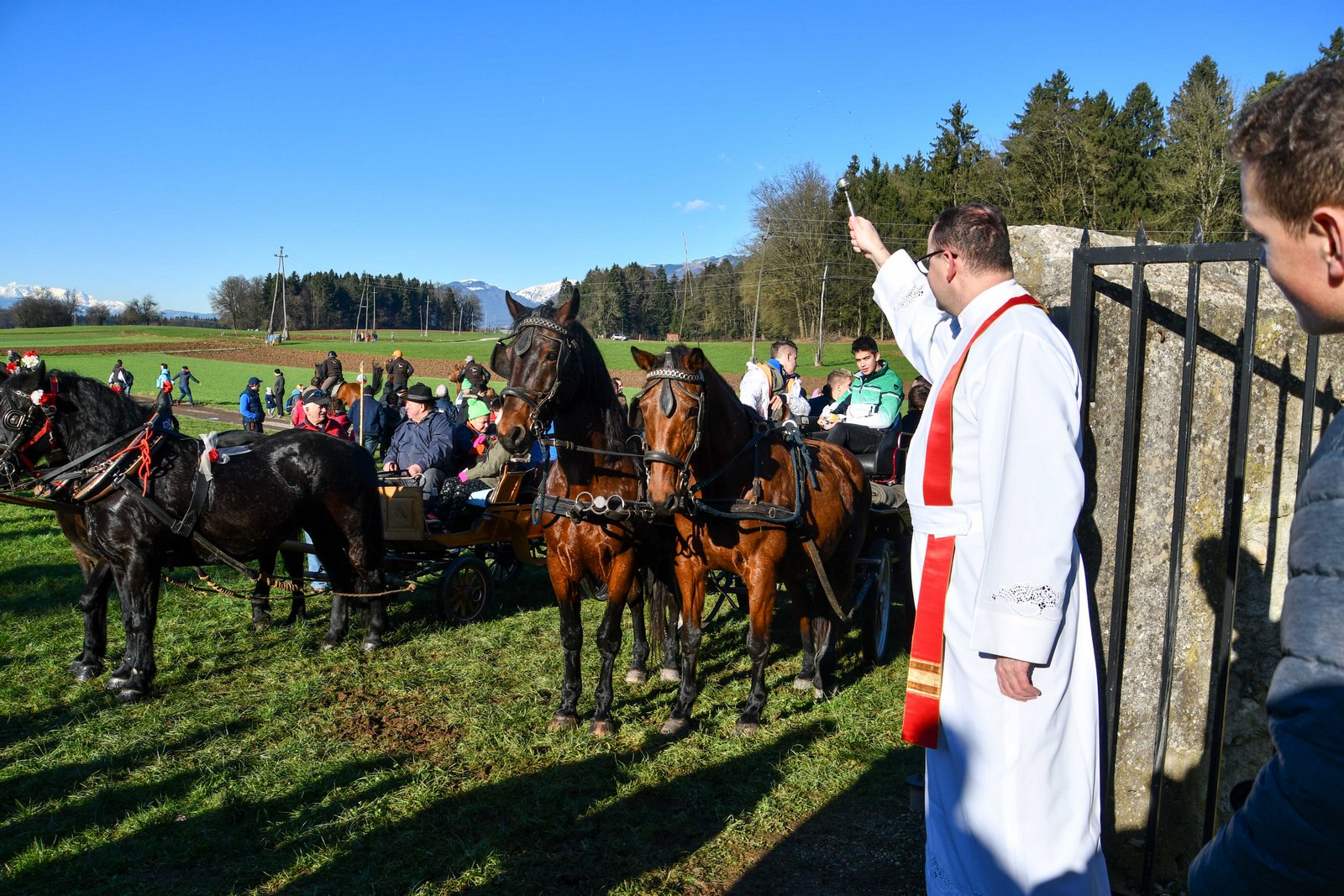 V četrtek, 26. decembra, smo obhajali god prvega mučenca in diakona svetega Štefana. Na ta dan je pri vseh svetih mašah blagoslov soli, ki jo potlej lahko dodamo naši hrani in krmi za živino. Ob 10. uri je bila sv. maša tudi na podružnici sv. Radegunde v Srednji vasi. Za začetek je Orkester občine Šenčur v prezbiteriju zaigral nekaj pesmi. Po maši je je bilo najprej tradicionalno nošenje ročno izrezljanih figuric domačih živali okrog oltarja, nato pa pred cerkvijo še blagoslov konj in vpreg. Več slik je tukaj in tukaj (foto: Janko Žibert).
